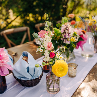 We set a long wooden table for 16 under the trees that truly burst with color and personality! The center of the table overflowed with delicate bud vases in all different sizes, shapes, and colors. They each housed a different colorful bunch of wildflowers with hues ranging from tangerine to fuschia to lemon to blush. Gold mercury votives perfectly interspersed the floral, mirroring the soft golden glow from the market lights overhead.