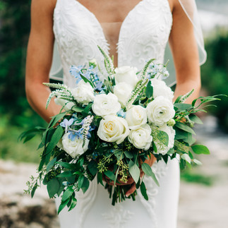 Amanda’s bridal bouquet had similar blue and white blooms in it. It was hand-tied with a wildflower quality to it, so that it looked like we could have plucked the flowers right out of the mountainside that very same day. Phillip’s boutonniere had one large white bloom with a smaller blue floral accent. It was all perfect for their blue and white wedding on top of a Montana mountain!