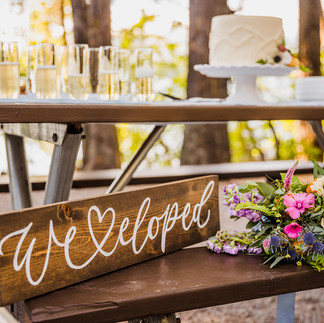 Their wedding cake had a white buttercream exterior with a mountain design. We gingerly placed colorful floral accents at the base of the cake to match Rachel’s bouquet and Pat’s boutonniere. We then poured champagne into the newlyweds’ personalized “We eloped” glasses, which echoed our signature “We eloped” wooden sign.