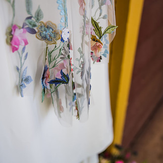 You can see these colors in Rachel’s colorful bridal bouquet, Pat’s boutonniere and tie, their wedding cake accents, and even in Rachel’s veil! Her wedding dress was an off-the-shoulder cream colored gown with a sweetheart neckline and buttons all the way down the back. Her veil was sheer white with delicate floral embroidery along the hemline.
