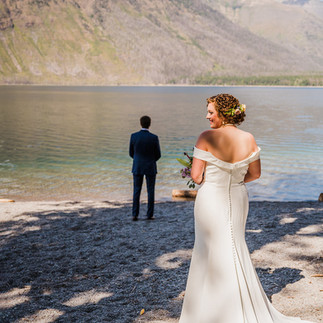 Rachel’s dapper groom wore a navy blue suit with periwinkle tie and bright orange boutonniere. It was a classically handsome look and was the perfect complement to Rachel’s bridal style! When he was ready, we brought him to the water’s edge at Lake McDonald Lodge for his first look with Rachel.