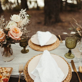 With an area as stunning as the Apgar Picnic Area offering views of nature surrounding Lake McDonald, it took very little to complement the space. To bring Rachel and Neil’s wedding vision to life, they opted for a golden hour color scheme in their floral from Mum’s. The muted peaches and pinks paired with green glass rentals and woodsy décor elements made the tablescape feel organic and natural.
